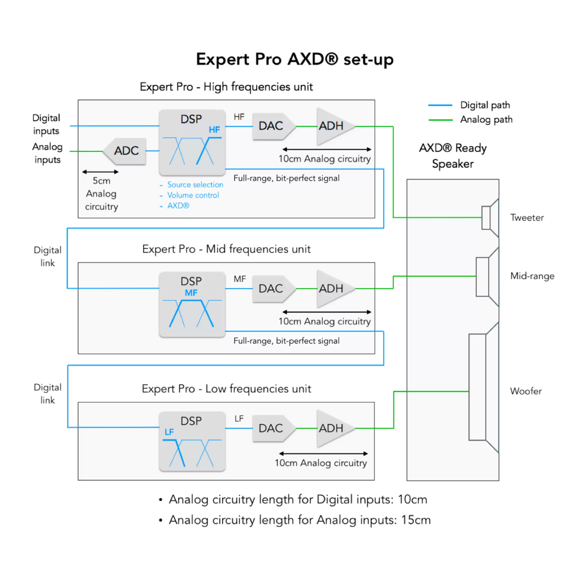 Today, more than 800 speaker models are SAM Ready but we wanted to go further and offer a solution to the most demanding audiophiles capable of taking the best from ultra high-end loudspeakers. That is why we developed a partnership with some of the top speaker manufacturers, to design the shortest analog signal path between an audio source and speaker drivers while limiting analog sections to a minimum. The result of this quest of perfection is AXD®, the perfect match between Expert Pro and some of the world’s best loudspeakers ever built.