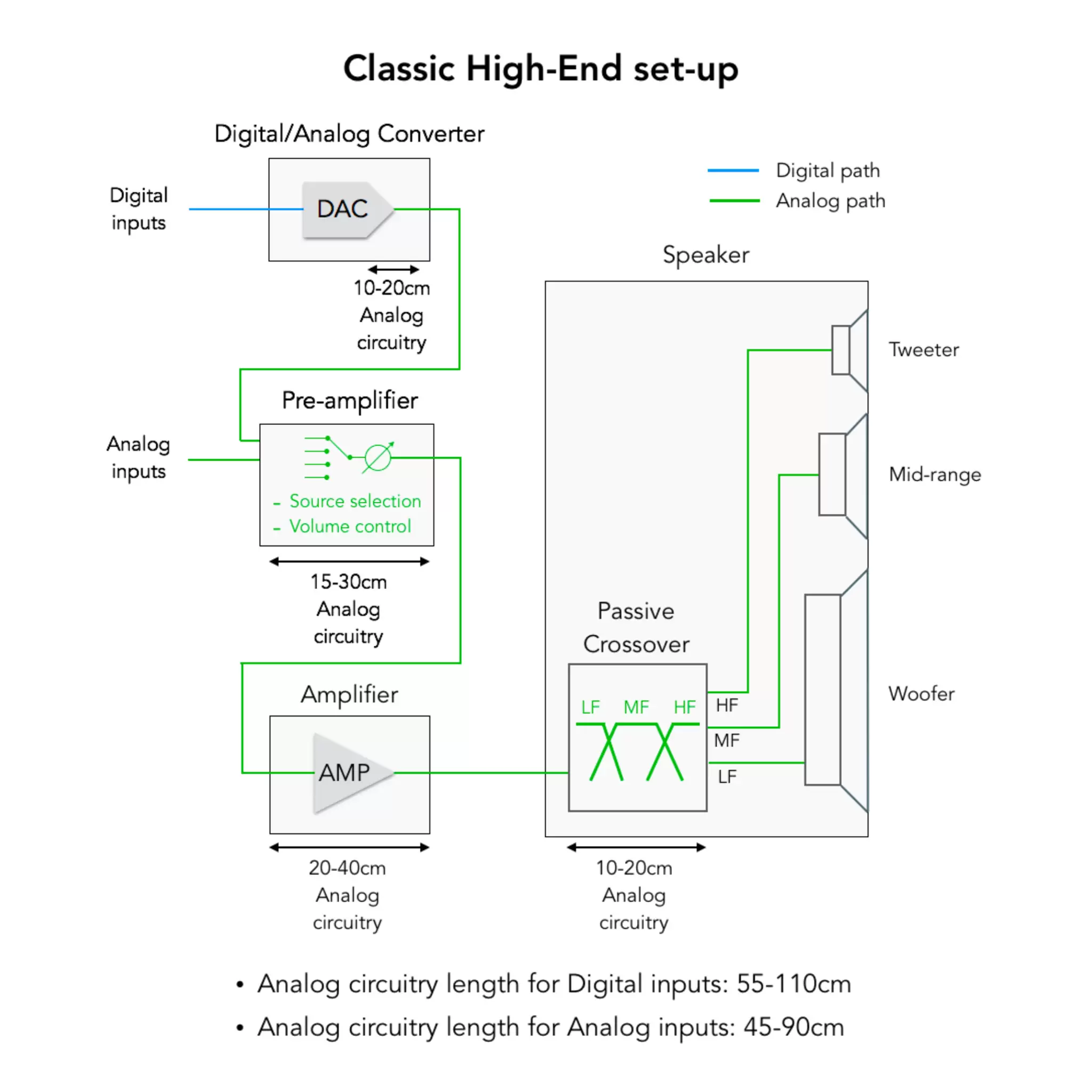 Every input signal has to go through a number of analog devices before being transformed into music by the drivers. On average, the length of analog electronic circuitry in a classic setup is 55-110 cm, excluding cables. Along this distance, according to the number of in between components in the signal path, the signal loses integrity, and distortion appears.