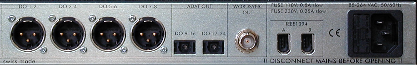 Outputs: Digital Audio outputs on Firewire (two connectors), XLR (AES/EBU), Toslink (ADAT, two connectors).