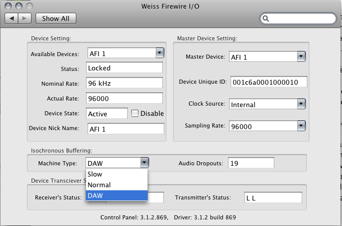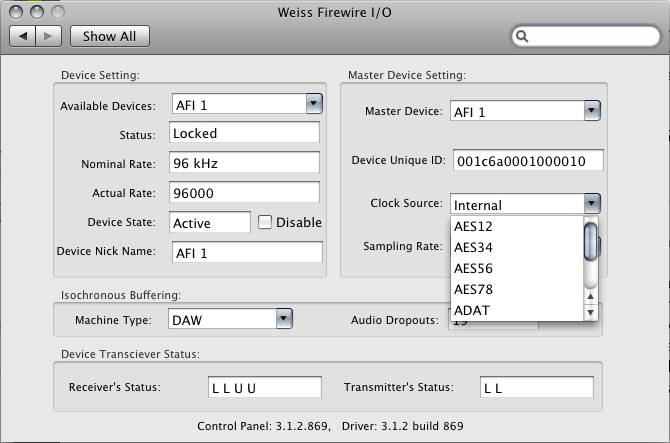 The biggest different that I find between Weiss AFI1 and other soundcard GUI is, Weiss AFI1 does not provide any metering. This is a headache when we connect all cables and hear no sound. We have no way to see if the Weiss AFI1 is functioning or having wrong patching or routing under sound panel. I do wish there will be a software upgrade that allow us to see a metering on all 24 channels inputs / outputs. Of course it will be better if we can assign select channels to multiple outputs, plus hardware mixing feature. The software compares to Lynx or RME mixer is too minimal. I will strongly suggest at least a level meter on I/O. TCD2220 supports this on hardware level. Maybe Weiss wants to release a firewire based hardware 24ch I/O meter pack to chain with AFI1. However a simple software meter within Weiss panel will help a lot.