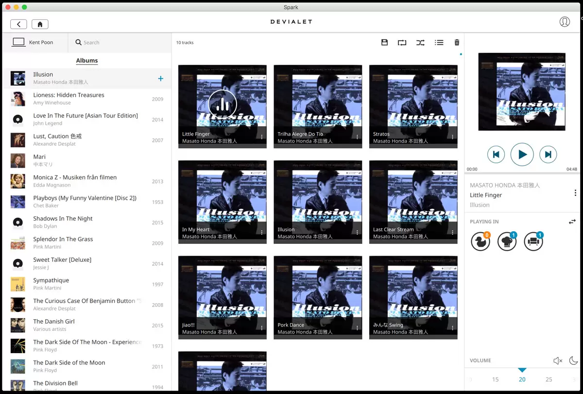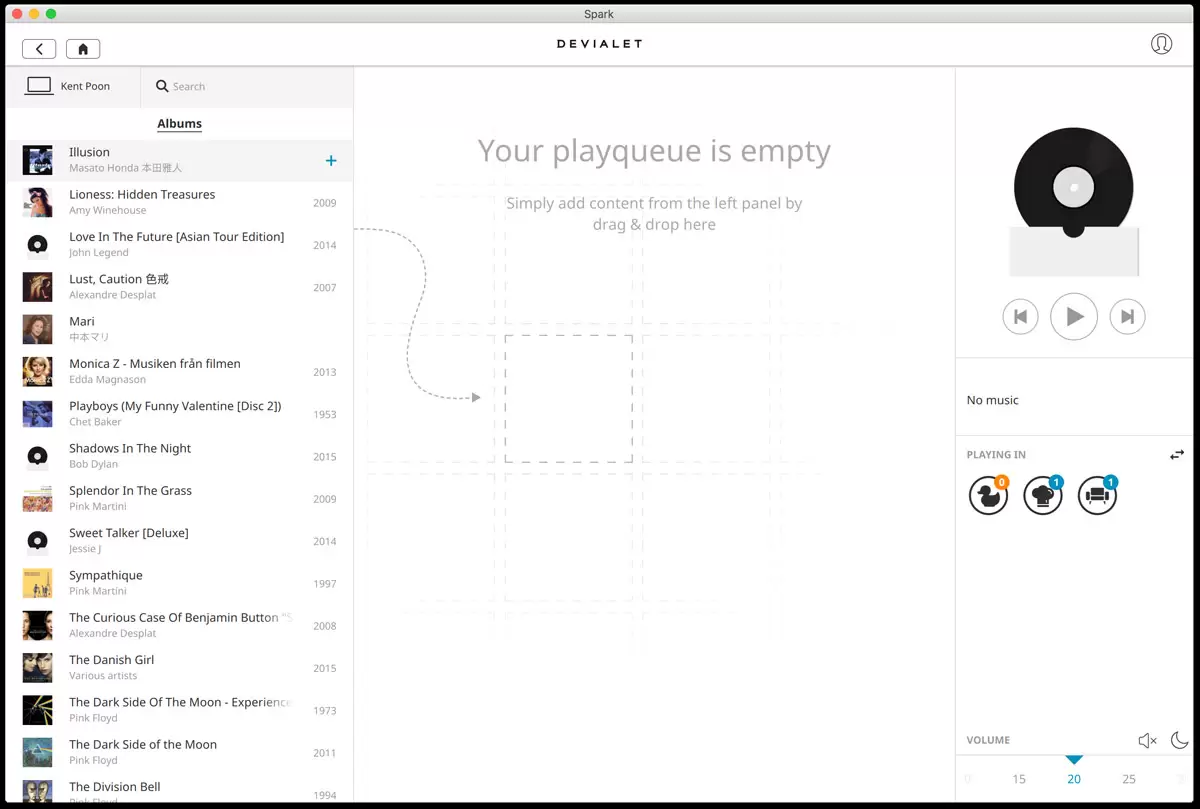 6. 我把第一個album按 “ + “鈕。中間部份便加入了整張專輯。最右邊部份控制播放Playlist及音量。你可以用任何一個裝置播放任可有加入Spark app的電腦及手機內歌曲。