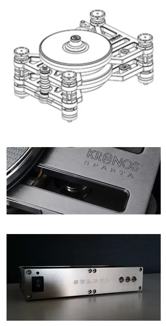 Kronos Sparata 擁有同樣的Krono Pro 專利技術,使用反方向式雙轉盤設計,採用兩個結構相同的金屬轉盤。 頂部轉盤以順時針方向轉動,下方另一個轉盤則以反方向轉動,兩者同時轉動時,就剛好將那股旋轉動力抵銷,完美解決了晃動問題,令黑膠播放時達到前所未有地穩定。結合4點式懸吊結構,達到了平穩均勻的轉動。Kronos Sparta 是把Kronos Pro一切的優點保持而使用能減少製作成本方式生產。獨立的電源供應遠離轉盤,被電供影響的機會減至最低。 附設一個極穩重的金屬碟壓。