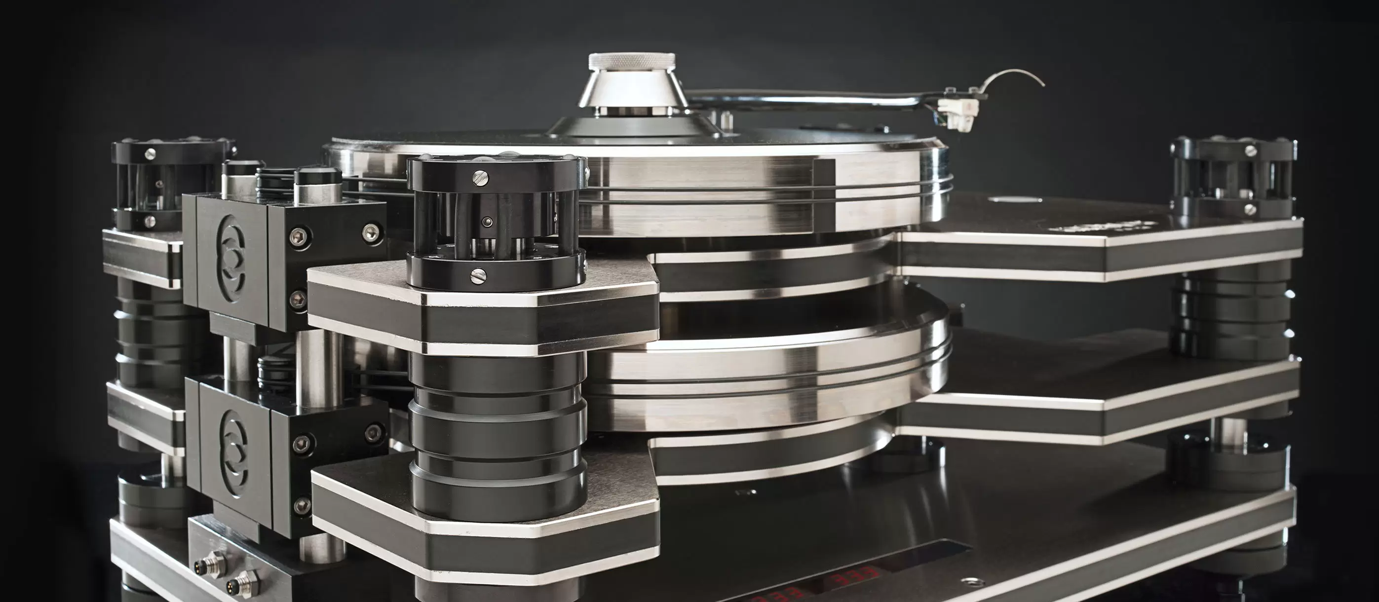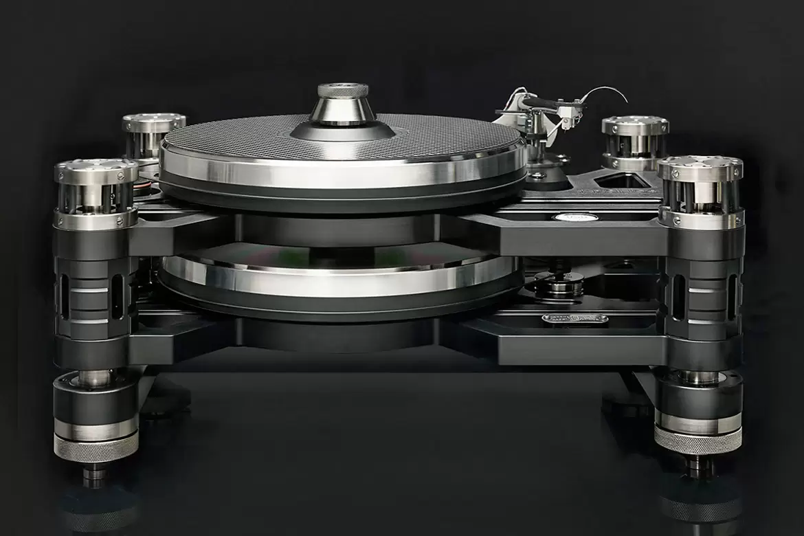 Kronos 擁有專利技術,使用反方向式雙轉盤設計,採用兩個結構相同的金屬轉盤。 頂部轉盤以順時針方向轉動,下方另一個轉盤則以反方向轉動,兩者同時轉動時,就剛好將那股旋轉動力抵銷,完美解決了晃動問題,令黑膠播放時達到前所未有地穩定。結合4點式懸吊結構,達到了平穩均勻的轉動。兩個轉盤分別各由一顆瑞士製 Maxon DCX22L 馬達驅動。 驅動器也是相當關鍵的因素,搭載貴重金屬電刷和Maxon特有的無鐵心繞組直流摩打及光學感應器,更能精準無誤地控制轉盤的速度。