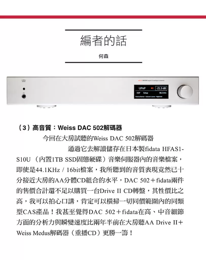 Weiss 瑞士數碼專業公司剛推出全新DAC501/502型號內置在2017慕尼黑音響展推出的3D音響重播技術。這技術是為了開發VR音響已出現的。究竟有什麼特別? 這個技術你一定要聽一聽。它推翻了我們使用喇叭聽音響一直存在的錯誤。 (https://goo.gl/R6Uofn) (https://goo.gl/ErkTeJ)