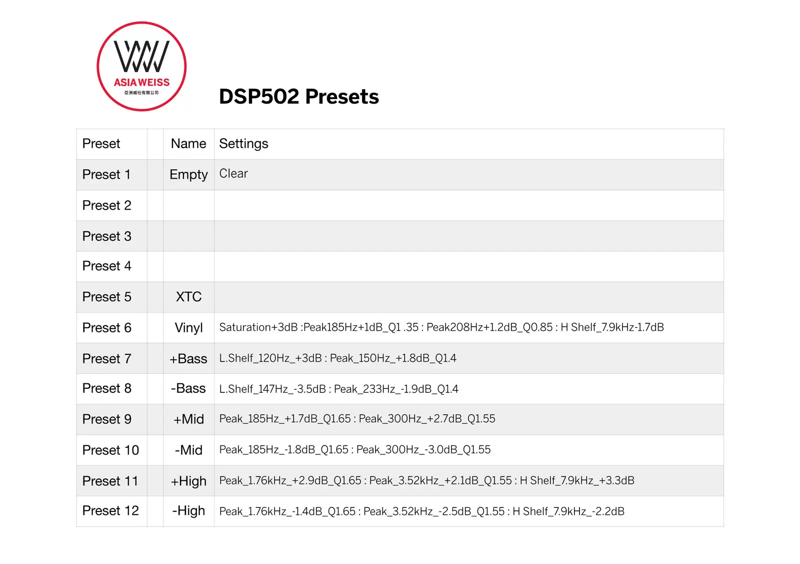 In order to help Weiss Series 5 (DAC501/502, DSP501/502) users get on hands, here I attached a EQ Presets suggestion.