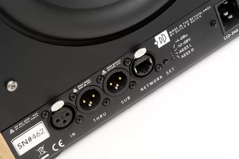The Network Ethernet input is self-explanatory (the 8c has no Wi-Fi adapter), and is required only to control the 8c’s settings, which is done through a web-based app accessed through the D&D website. Once these settings are made, the 8c’s will work fine without being connected to your home network. The balanced Sub output can be customized through the app, which can also be used to apply various equalization options: high-/low-pass filters, peak filters, delays, phase inversion, etc. The balanced Thru output accommodates users who want to feed the 8c a digital signal via a balanced AES/EBU 110-ohm cable. You connect the digital source to the left (or right) speaker input, select L with the Set button, then connect the Thru output from the left speaker to the single input of the right speaker, select R with Set on the right speaker, then finally insert the XLR termination connector (supplied by D&D) in the Thru output of the right speaker. Since all functions, including the crossover, are implemented in the digital domain, the 8c immediately converts all analog signals to digital with its built-in A/D converter.