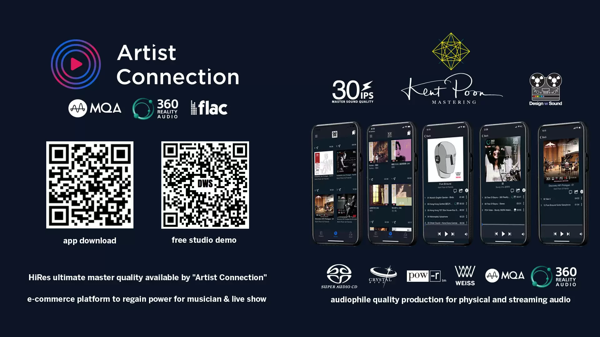 籌備超過兩年,與美國Streamsoft Inc合作,率先推出全新音樂串流平台Artist Connection! 只需要掃描QR碼下載免費App,便可立刻試聽高品質音樂!