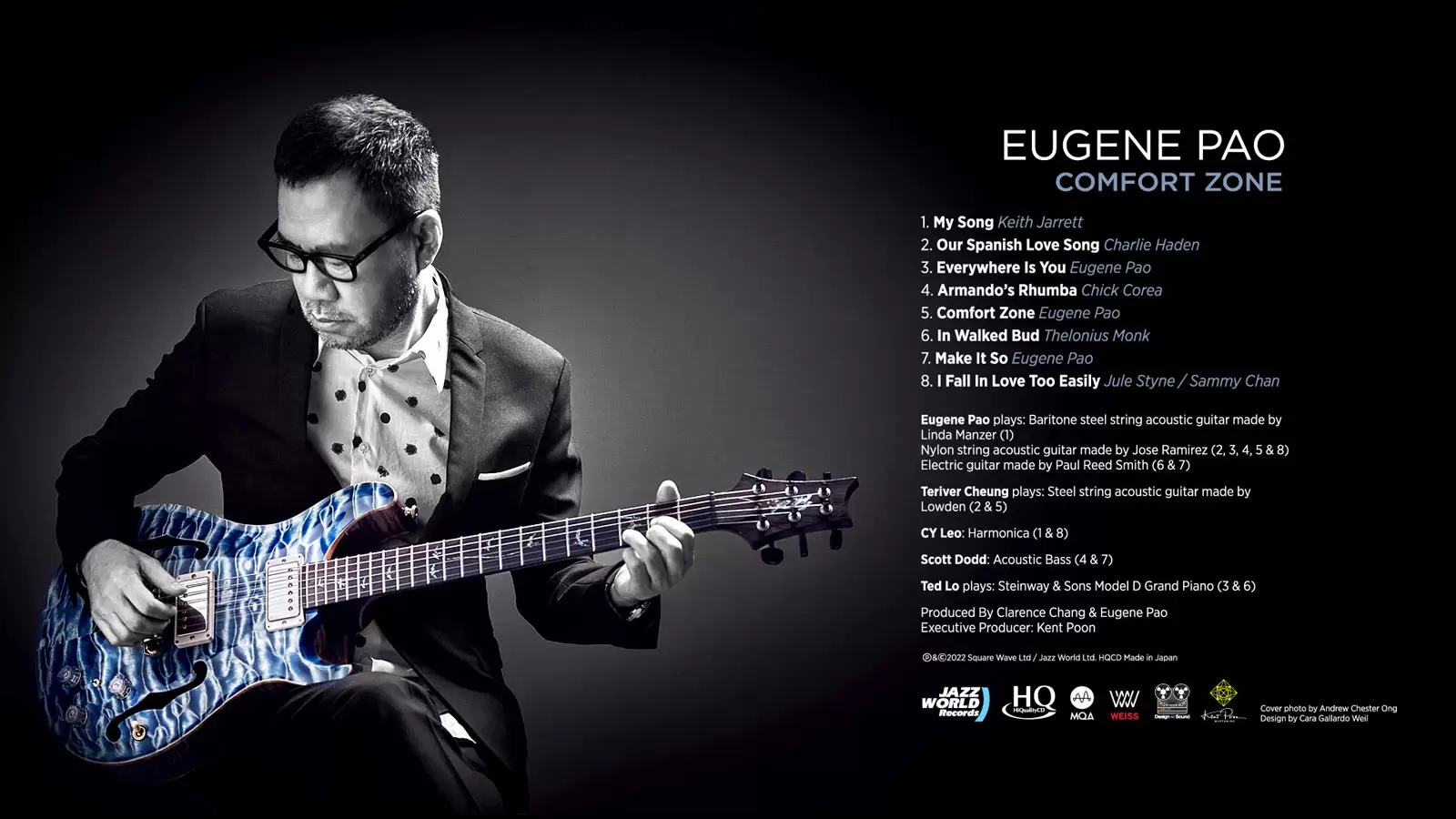 疫情前我有一半業務和時間都不在香港,甚至錄音工作都多在外地進行。疫情將世界改變,大家也辛苦了。當時製作Sherine Duo專輯「Two For The Road」(另一張未來再介紹的專輯) 歌曲 “But Beautiful” 首次跟Eugene合作,發現大家對聲音上追求非常吻合,有音響發燒友背景,在Sherine與他的Baritone結他合奏錄音,超低音的結尾顯然易見。同時遇到Clarence Chang,香港爵士音樂會知名搞手,更是著名唱片監製。(2022年是他監製的夏韶聲“諳”專輯24周年, 今個夏天將有慶祝活動) 。經過幾次見面,言談甚歡。Clarence能照顧好唱片概念,選曲風格,與樂手們音樂上交流需求。我專注製作上,繼續與音響器材及錄音技術談戀愛。Clarence辦音樂會是用 “Jazz World Live Series JWLS”名稱,他提議唱片Label名稱上,加入我代理業務的”方浪音響 SquareWave”,但我認為簡單比較好,”Jazz World Records (JWR)” 由此而來。