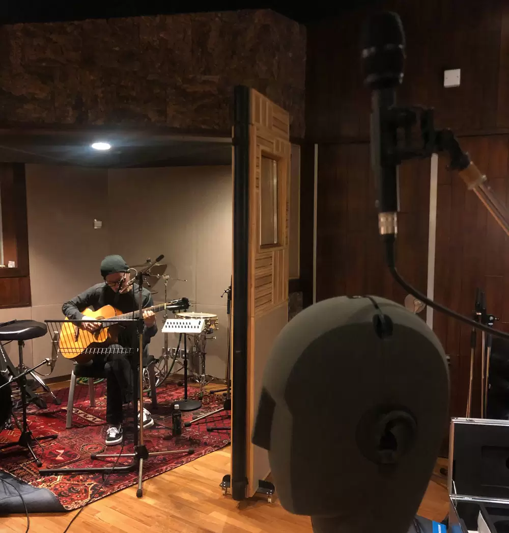 27/9/2021 Teriver x Eugene 咪高峰數目比正常多,一共有14ch。每支結他有兩支close mic, Nordic NU100KBlumlein, Sennheiser Ambeo,Neumann人頭咪,連高度的天空聲道都有收錄。因為兩支結他音壓較平均,所以採用較古典錄音方法進行。兩首歌曲Teriver用的都是鋼弦結他,而Eugene都是使用尼龍絃吉他。