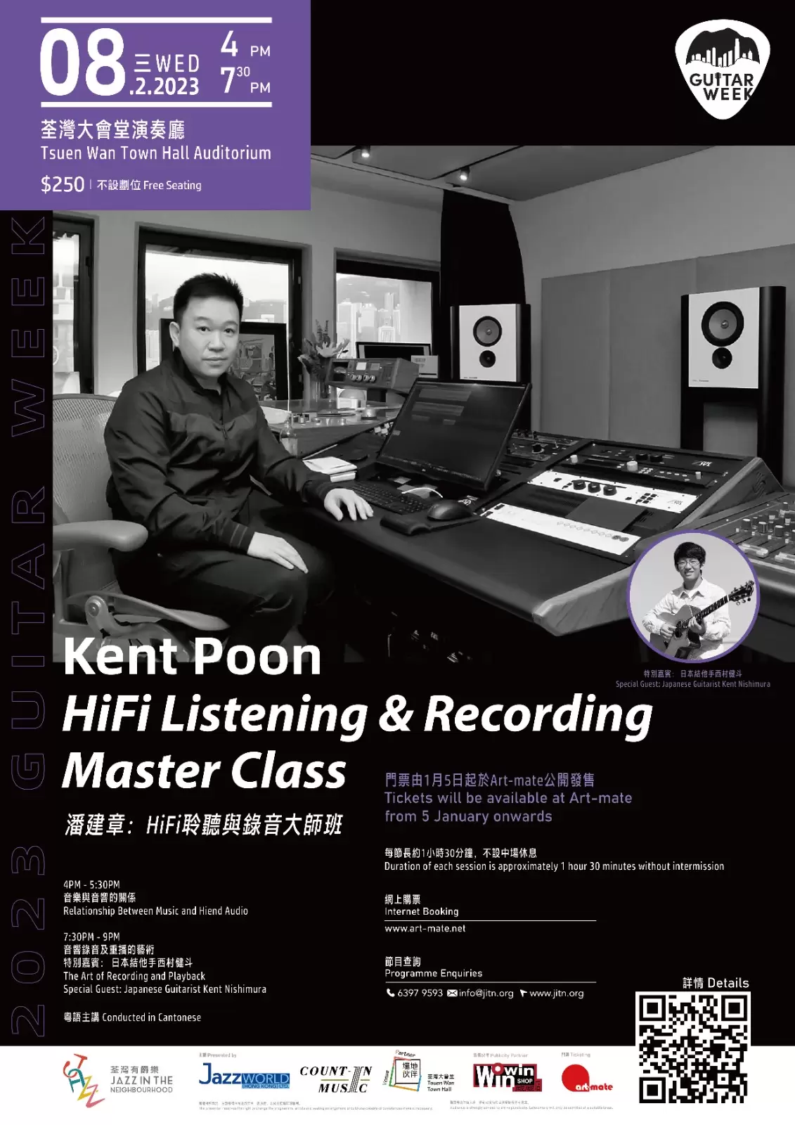 Kent Poon – HiFi聆聽與錄音大師班 日期: 2月8日 (星期三) https://art-mate.net/doc/65695 講座示範活動分兩節: 每節90分鐘 1) 音樂與音響的關係 (4pm – 5:30pm) Relationship Between Music and Hiend Audio – 大會堂演奏廳作百萬音響系統示範及講座 – Kent Poon 一生中5首重要歌曲介紹及示範 – 音響重播與空間關係,特性及示範 – 數位檔案及串流平台結構建議及優化方法 – 特別嘉賓: Feversound.com 國仁介紹音樂及導賞