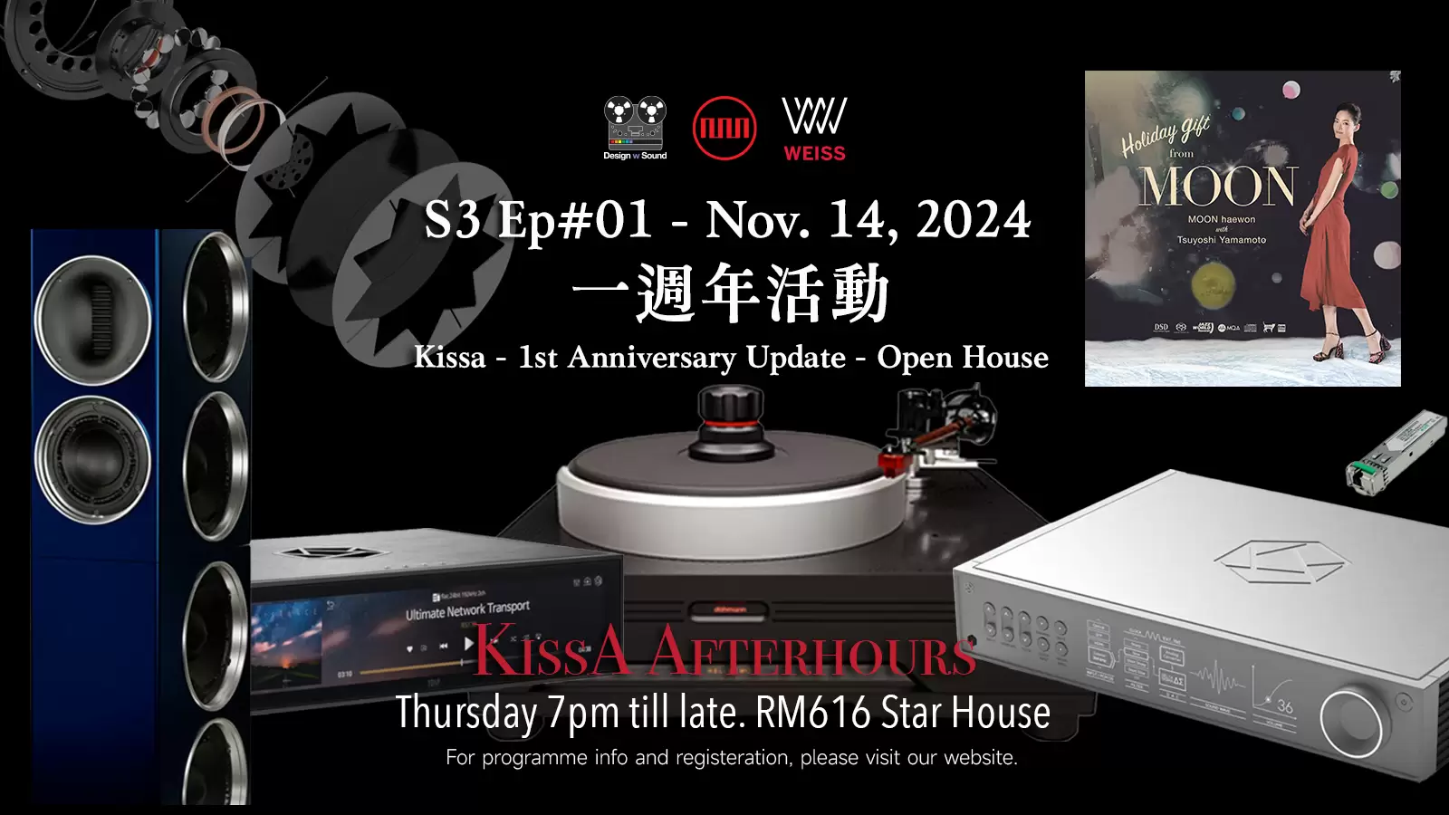 Kissa AfterHours 已經一周年了! 第三季S3音響活動正式開始! 今個星期四,晚上七時Open House公開展示最新產品以及音響世界的不同元素。 唔係淨係講音響器材, 仲可以討論唱片製作,音響科技,音響歷史故事以及你想知道的音響問題或題目,我們都盡力回答及交流。無論閣下是音樂或音響發燒友,音響同行,甚至專家們我們都希望由這個AfterHours系列,跟同好互動吓, 搵吓音響聆聽的愉快。 當然我們還會準備好音樂播放, 飲料及食品。 同事們可以一邊輕鬆跟Kent Poon Happy Hour (加班),另一邊增加音響知識與樂趣。每位成功參與活動朋友都可以獲得高清原音母帶音頻示範工具專輯 (非賣品)