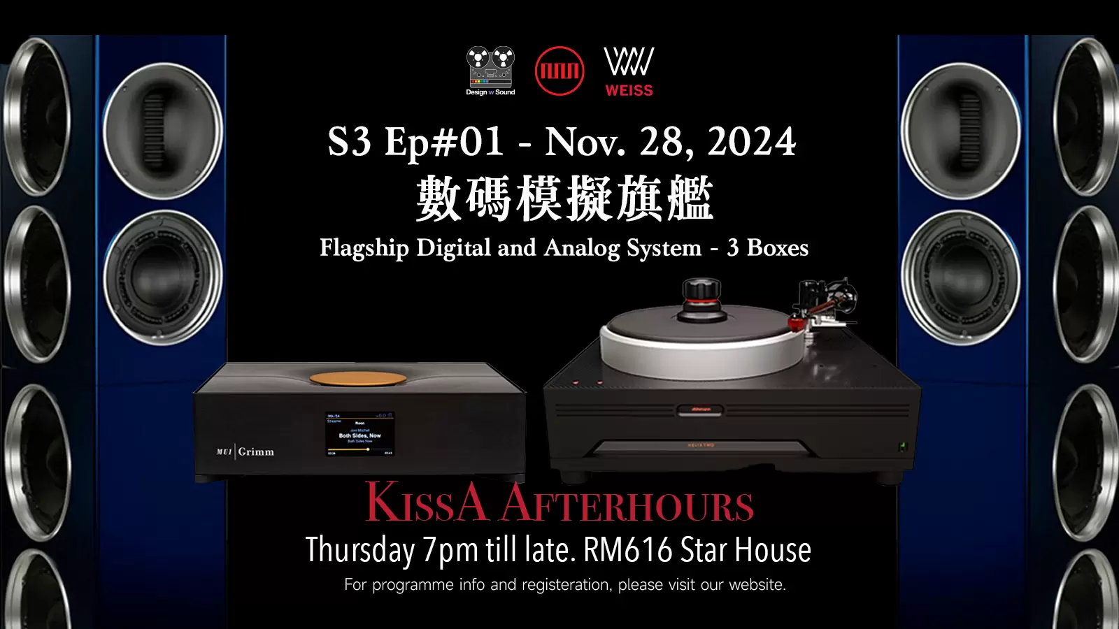 Kissa AfterHours 已經一周年了! 第三季S3音響活動正式開始! 今個星期四,我們公開展示最新產品,夢想的完美音響系統,音響世界的不同元素。 唔係淨係講音響器材, 仲可以討論唱片製作,音響科技,音響歷史故事以及你想知道的音響問題或題目,我們都盡力回答及交流。無論閣下是音樂或音響發燒友,音響同行,甚至專家們我們都希望由這個AfterHours系列,跟同好互動吓, 搵吓音響聆聽的愉快。 當然我們還會準備好音樂播放, 飲料及食品。 同事們可以一邊輕鬆跟Kent Poon Happy Hour (加班),另一邊增加音響知識與樂趣。每位成功參與活動朋友都可以獲得高清原音母帶音頻示範工具專輯 (非賣品)