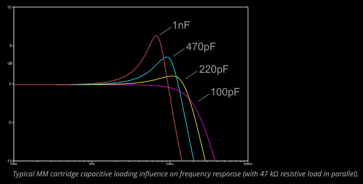 請注意,這些值並不是非常關鍵,如果您發現唱頭聽起來有點沉悶或有點太亮,請隨意嘗試。在上圖中您可以看到電容負載的影響。MM唱頭具有相對較高的電感,這會導致高頻損失。在負載中添加小值電容器將引起限量的共振,從而提升20kHz區域內的頻率響應,從而糾正高頻損失。然而,電容過大將導致不必要的峰值。