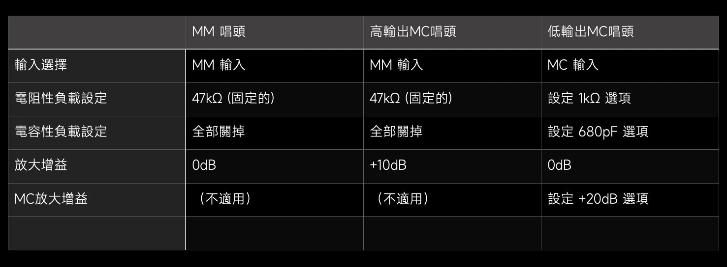 在實驗過程中,請遵循上面描述的增益設定順序,因為這可以確保最高的信噪比和最低的失真。因此先嘗試+20dB設定。如果輸出太低,則添加+10dB的「增強」。如果仍然太弱,則將MC增益設為+30dB。請注意,使用 30dB MC增益設定和通常敏感的 MC唱頭可能偶爾會導致唱機擴大機過載。拾音器靈敏度的差異很大,範圍從 50µV 到接近 10mV(@